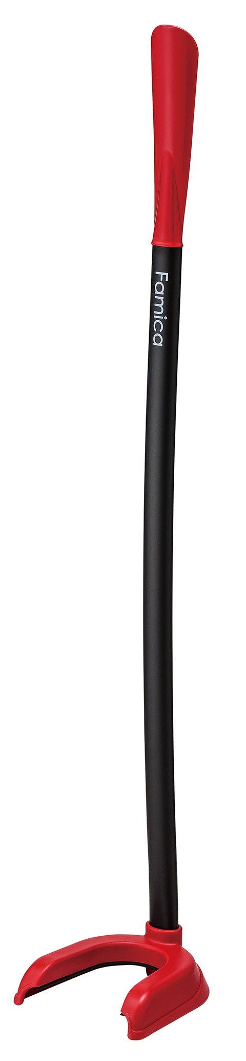 It is a colorful plastic shovel that can be comfortably used with its hands in a long posture.