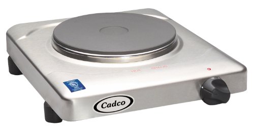 Cadco portable cast iron hot plate with 7.125" element and high-tech thermostat offers sensitive heat control to keep food simmering or boiling. Solid element delivers heat evenly to pot/pan. 120 volts and 1500 watts. UL safety and sanitary/c-UL.