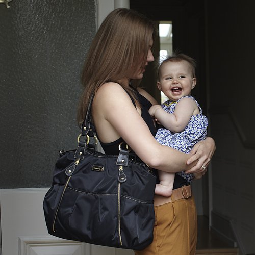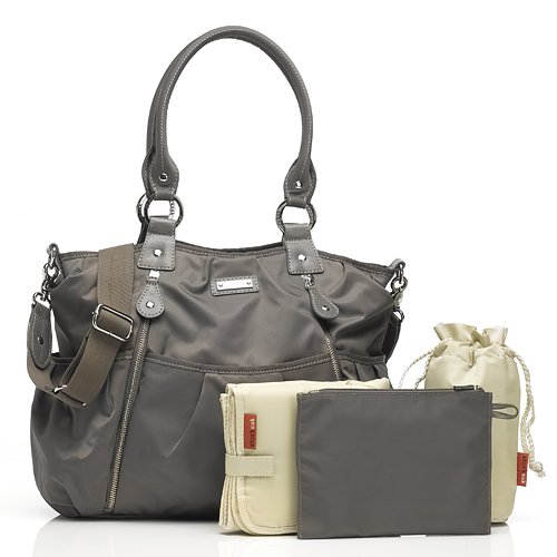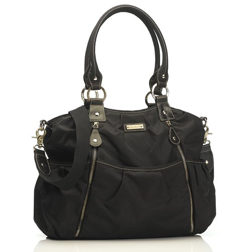 - Feature : Wipe clean nylon bag made with zipper top and faux leather trim / Includes removable insulated bottle holder & padded changing mat / 5 outer pockets & 6 inner pockets for cell phone and all baby's necessities / Shiny silvertone hardware / Dimensions: Height 13 inches Width 17 inches Depth 5 inches