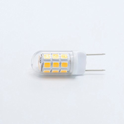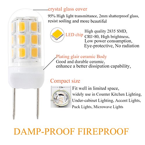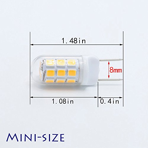 - [Mini Size] The G8 bulb is ultra-bright with 24 pcs 2835 SMD LED light source. Standard Bi-Pin G8 base, super mini size design: 1.48×0.4in( 37.6×10.2 mm)Currently it is available in warm white 2800K and daylight white 6000K.※The led g8 light bulb may keep glowing slightly even when you turn off power, because a small amount of electricity still run through traditional dimmer or switch which you never notice but LED chips are sensitive to it. This is a common phenomenon and does not affect using.