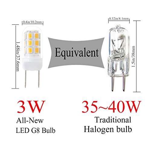 - [Energy-Saving] The all-new g8 led bulbs are only 3 watts to emit the same light as a 35~40 watt halogen bulb, its reduced energy consumption nearly 90%. NO flicker. NO mercury.※A good quality and LED compatible dimmer is needed to control the brightness. Since most applications use old dimmer which doesn't work well for LED bulbs, this G8 LED bulb may flicker at maximum dimming/ lower-setting.