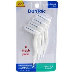 Product DescriptionDentek Brush Picks 8 Brushes Per 1 Pack. Angled Design. Convenient and portable floss pick. Nylon coated wire.Absolutely brand new in manufacturer's packaging.0