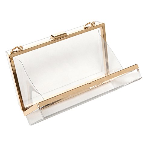 - Feature : A luxurious and glamorous transparent hard-case clutch purse featuring a stunning gold-tone clasp and chain strap for elegance. / Soft plastic flaps on either side of the interior to help keep your belongings from falling out when opening the purse. / Made of hard acrylic plastic. / **Official MG Collection® product by MyGift® features signature keychain charm**, satin gift bag, and gift box. / Approximate Dimensions: Exterior - 7" L X 2" W X 4.5" H; Interior - 7" L x 2" W x 4.5" H; Shoulder Strap (fully extended) - 24.25" shoulder drop.