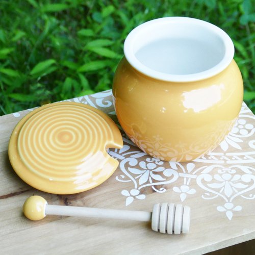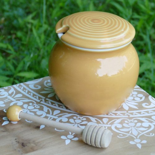 Honey Pot, Yellow Porcelian Honey Jar With Wooden Dipper, Honey Keeper By Tumbleweed