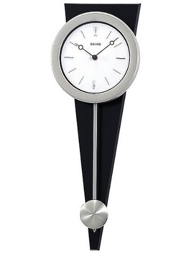 The dramatic, angular lines of the Seiko Wall Pendulum Clock add a modern edge to your home or office. Constructed with a black triangular base made of solid wood, the watch includes a silver-tone case and a swinging silver-tone pendulum. A glass crystal protects the white dial, which features slim black hour markers with silver accents at the three, six, nine, and 12 o'clock. The dial also includes modern black hour-and-minute hands.Feature