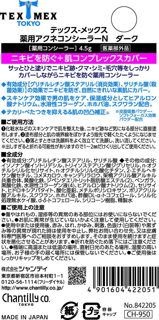 全成分:【有効成分】:グリチルレチン酸ステアリル、サリチル酸【その他の成分:イソノナン酸イソトリデシル、トリイソステアリン酸ジグリセリル、n-オクチルシリル化セリサイト、n-オクチルシリル化酸化チタン、2-エチルヘキサン酸セチル、コメヌカロウ、キャンデリラロウ、架橋アクリル酸アルキル共重合体、黄酸化鉄、ジペンタエリトリット脂肪酸エステル(2)、ベンガラ、黒酸化鉄、水溶性コラーゲン液(4)、ヒアルロン酸ナトリウム(2)、セリサイト、ヒドロキシアパタイト、酸化亜鉛、メチルポリシロキサン、ポリアクリル酸アルキル、スクワラン、ホホバ油、酢酸DL-α-トコフェロール、シリル化処理無水ケイ酸、d-δ-トコフェロール、シリコーン樹脂、精製水