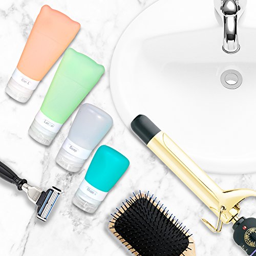 Leak Proof Travel Bottles - 4 Refillable TSA Approved Silicone Containers For Liquids With Carry-On Bag - BPA Free - For Shampoo, Conditioner, Soap, Lotion,...