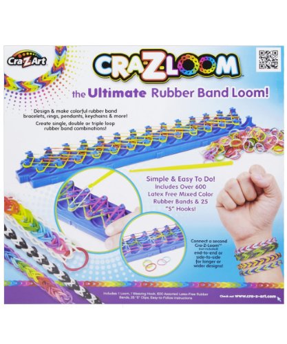 - Feature : Create a world of Rubber Band Bracelets, Necklaces, Rings and More! / Super Unique Cra-z- Loom(TM) makes trendy rubber band wearable's! / Contains 600 assorted color latex free rubber bands, connecting "S" hooks and looping hook / Instructional Booklet featuring simple to more advanced Rubber Band Bracelets Made Simple & Easy with step by step illustrations and photos / Simple and easy to do, includes everything you need