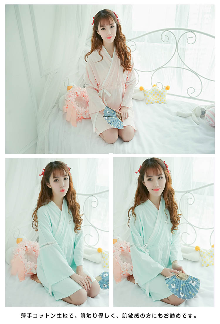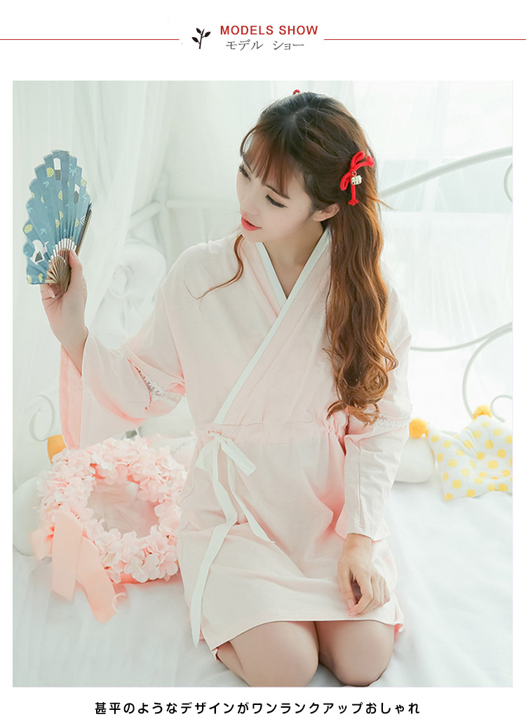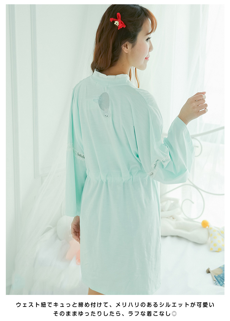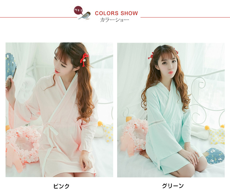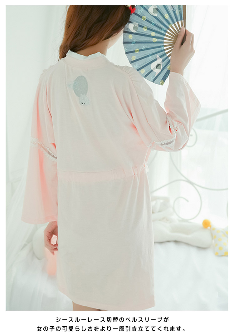 | オリジナルデザインの可愛いパジャマワンピース甚平のようなデザインがワンランクアップおしゃれシースルーレース切替のベルスリーブが女の子の可愛らしさをより一層引き立ててくれます。薄手コットン生地で、肌触り優しく、肌敏感の方にもお勧めです。ウェスト紐でキュっと締め付けて、メリハリのあるシルエットが可愛いそのままゆったりしたら、ラフな着こなし◎ | |