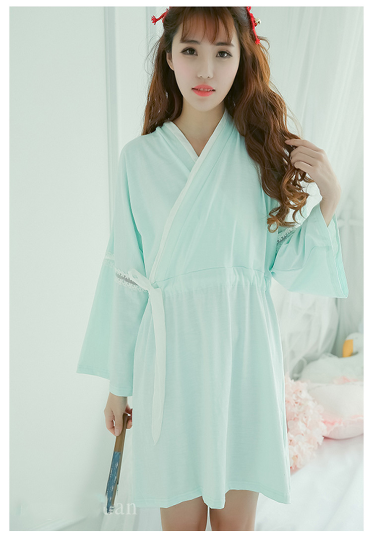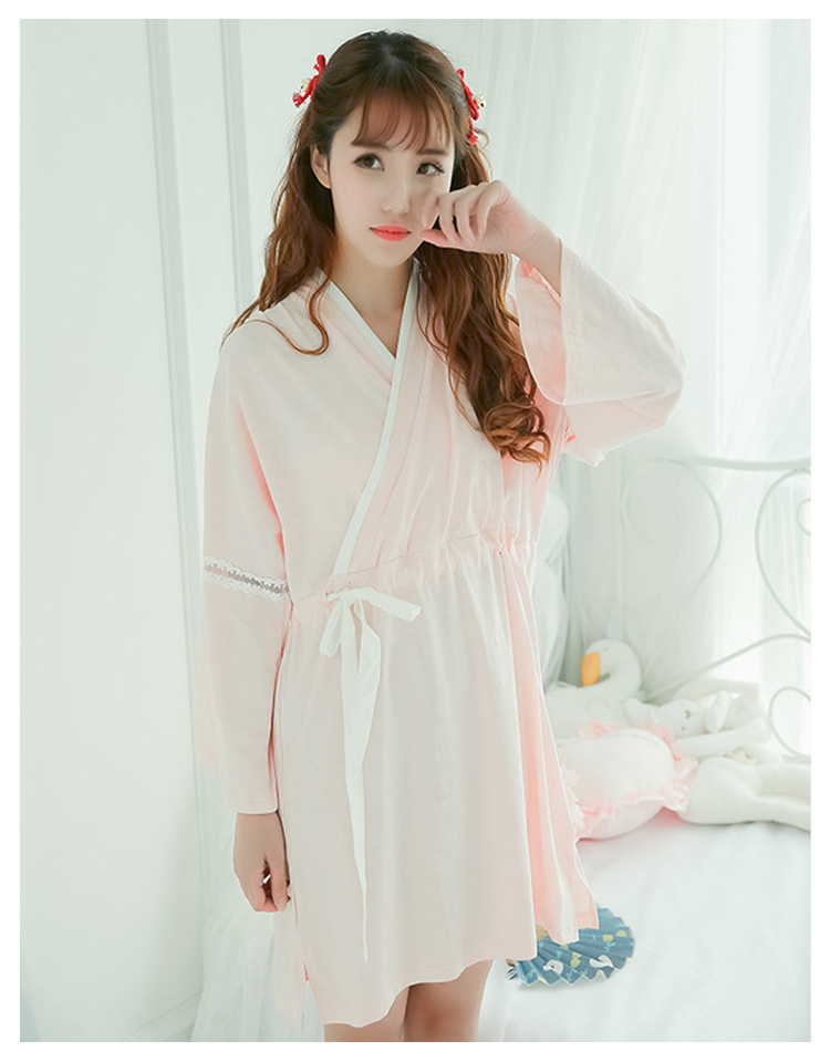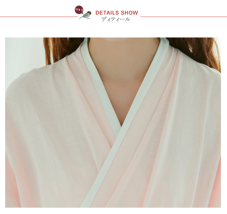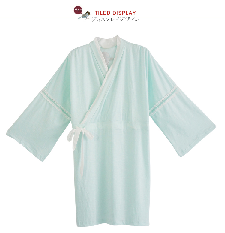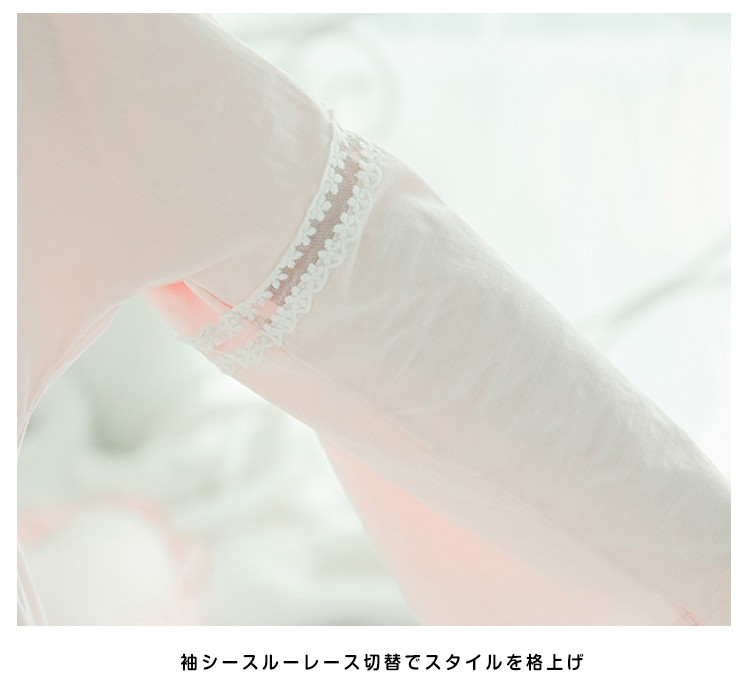 | オリジナルデザインの可愛いパジャマワンピース甚平のようなデザインがワンランクアップおしゃれシースルーレース切替のベルスリーブが女の子の可愛らしさをより一層引き立ててくれます。薄手コットン生地で、肌触り優しく、肌敏感の方にもお勧めです。ウェスト紐でキュっと締め付けて、メリハリのあるシルエットが可愛いそのままゆったりしたら、ラフな着こなし◎ | |