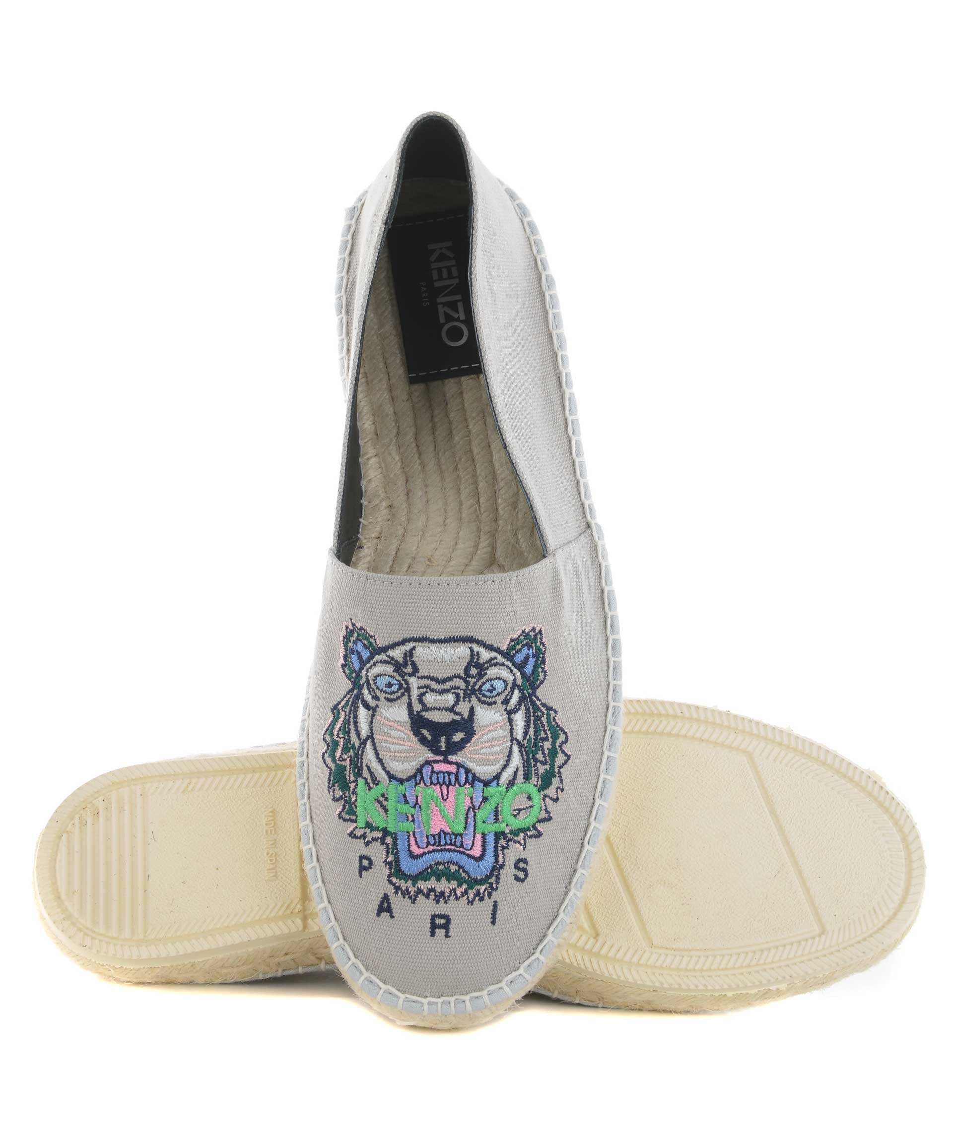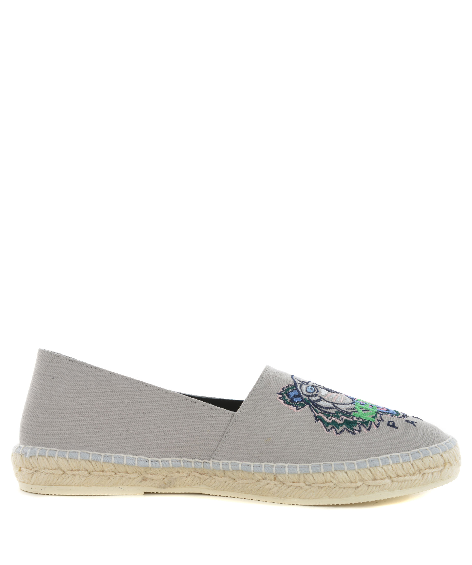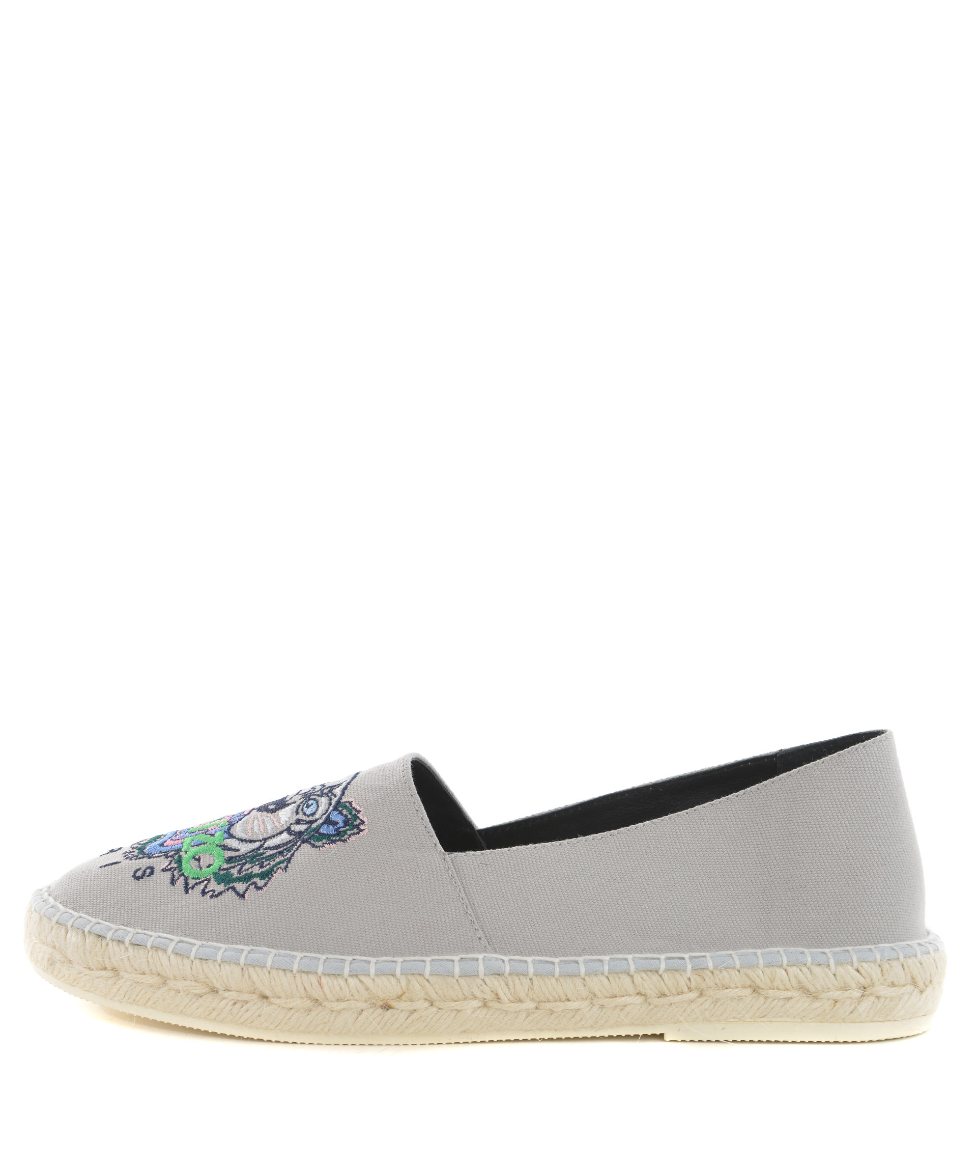 Tiger Espadrilles from Kenzo: Gray Tiger Espadrilles with round toe, slip-on design, embroidered logo detail, a branded insole, a braided raffia midsole and a flat rubber sole.