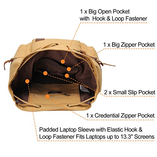 Spacious Backpack has a roomy main compartment and enough interior pockets for your needs :1 big open pocket, 1 zipper pocket, 2 small slip pockets, 1 credential pocket, soft padded sleeve fits most laptop or tablets up-to 13.3 inch