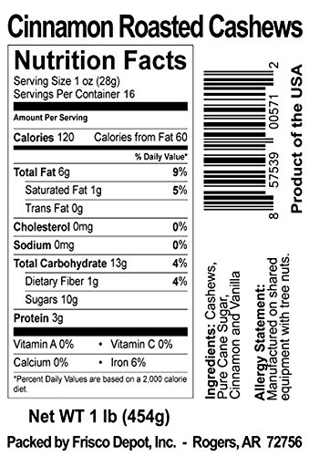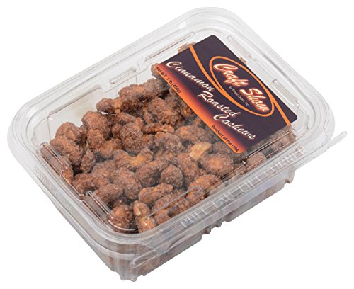 -. Feature : 1 pound of Premium 240 Cashews roasted in cinnamon and vanilla then glazed with a touch of sugar / Ingredients: Cashews, Cinnamon, Sugar and Vanilla; cashews are a healthy nutritious snack / Roasted in small batches guarantees freshness; packed with flavor and a crunch in every bite / Safe-T-Fresh tamper evident container (5.75" x 7.25" x 2.75"); snaps closed with a tight seal / No salt, cooking oil, dairy products added; gluten free; Craft Show cashew made in the USA