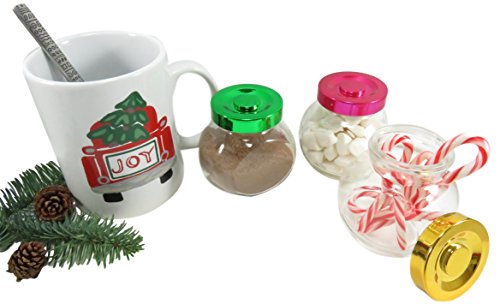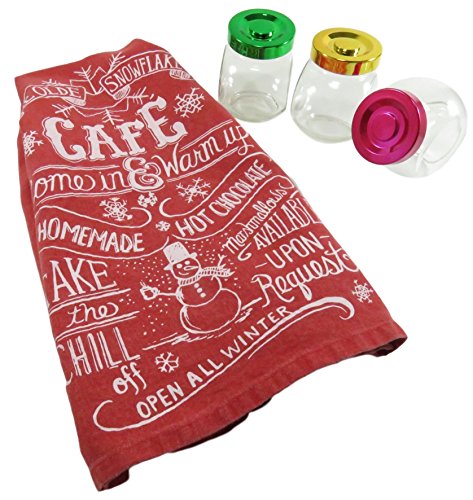 - COME IN AND WARM UP: Welcome friends and family into your home with the enticing offers of hot chocolate, marshmallows, taking the chill off, open all winter, and other fun sayings on the cute red dish towel (28” square, 100% cotton, iron if desired - by Primitives by Kathy). The set also includes 3 small glass jars (3.25” x 3.25” - by Daiso Japan) with green, magenta and gold metallic lids. The candy, sprinkles, mug and greenery are for demonstration purposes only and not included.