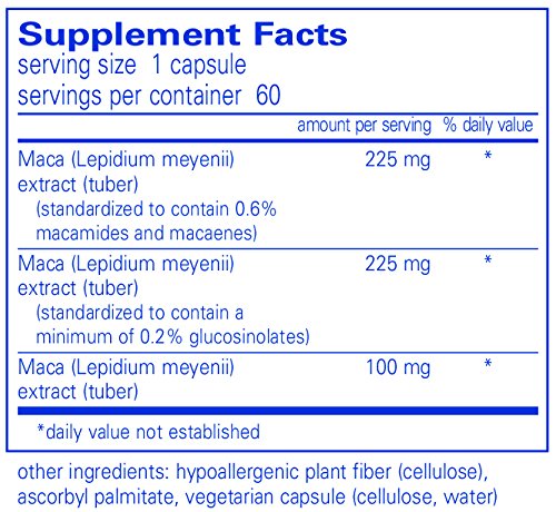 - Feature : Maca-3 combines various maca extracts to provide the synergy of constituents prized for promoting male and female libido and healthy reproductive system function.* / Hypo-allergenic dietary supplement / 60 capsules / 1-2 capsules daily, in divided doses, with or between meals.