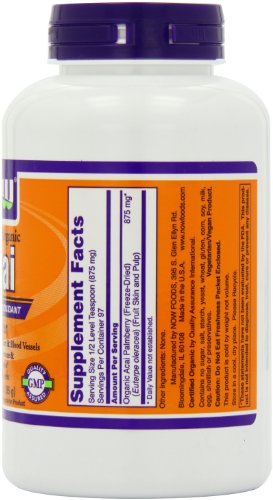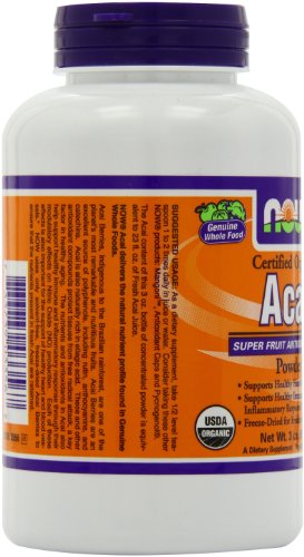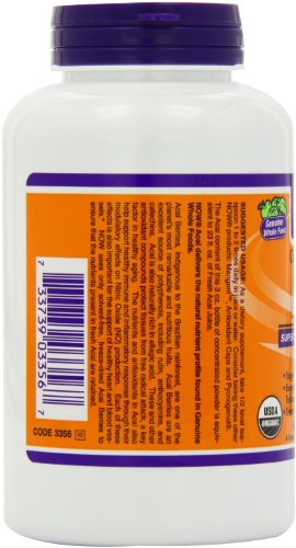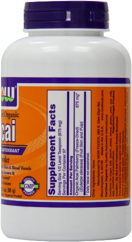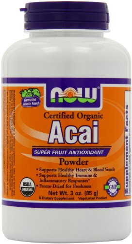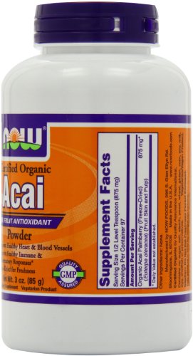 Certified Organic Super Fruit Antioxidant Supports Healthy Heart Blood Vessels Supports Healthy Immune Inflammatory Responses* Freeze-Dried for Freshness A Dietary Supplement Vegetarian Product Acai Berries, indigenous to the Brazilian rainforest, are one of the planet's most remarkable and nutritious fruits. Acai Berries naturally contain Vitamin C and are an excellent source of polyphenols, including rutin, anthocyanins, and catechins. Acai is also naturally rich in ellagic acid. These and other antioxidant compounds protect tissues from free radical attack, a key factor in healthy aging. The nutrients and antioxidants in Acai also help support healthy immune and inflammatory response through their modulatory effects on Nitric Oxide (NO) production. Each of these effects is also important for the support of healthy heart and blood vessels.* NOW uses only solvent-free, freeze-dried Acai Berries to ensure that the nutrients present in fresh Acai are retained.Feature
