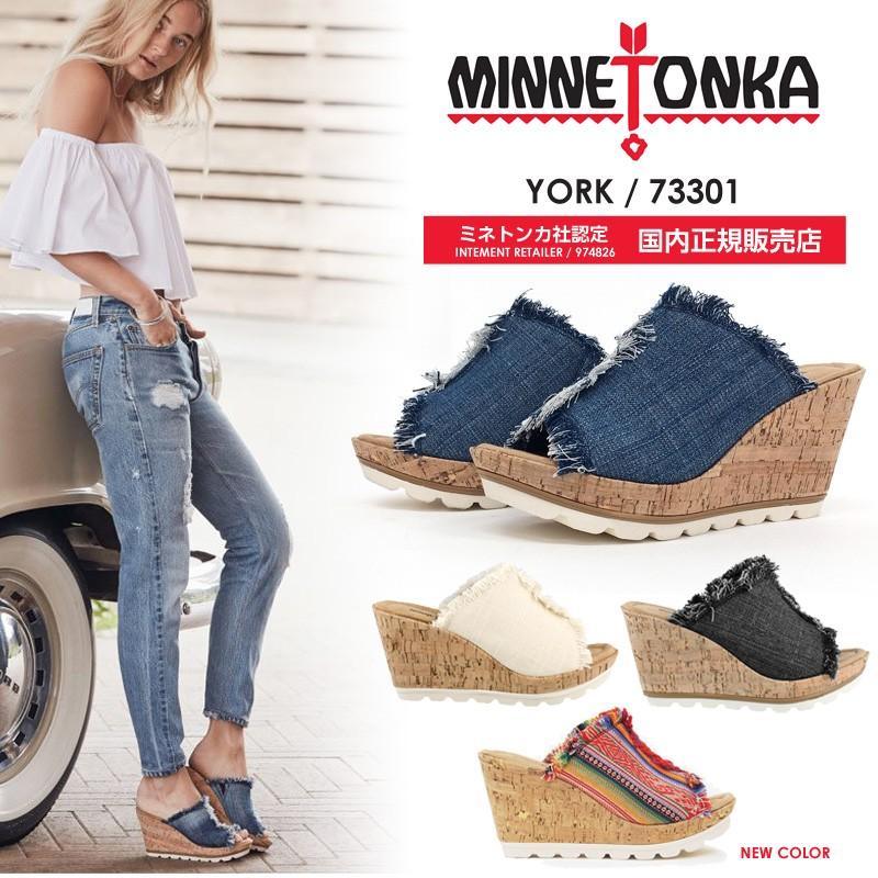 ミネトンカ MINNETONKA YORK ヨーク サンダル レディース 女性用 LADYS 白 ホワイト 紺 ネイビー グレー マルチ デニム フリンジ ウェッジサンダル ヒール WHITE NAVY GREY MULTI 73301 送料無料