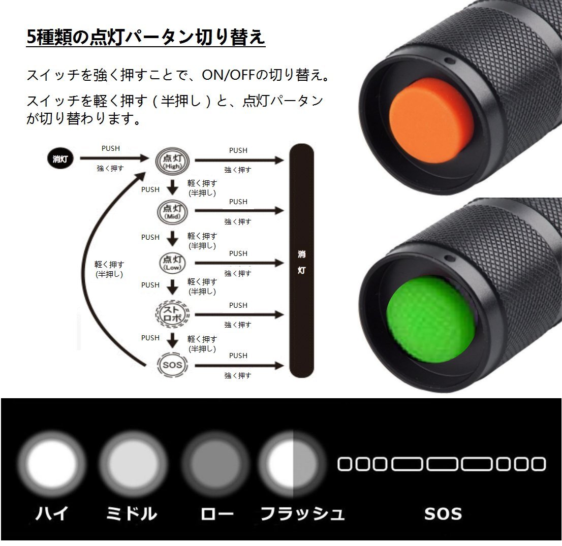 5 Mode: High / Middle / Low / Flashing / SOS