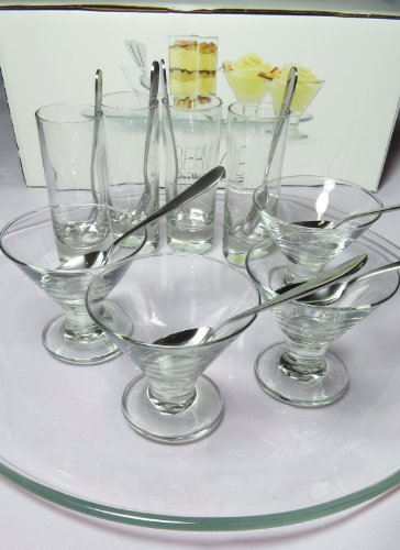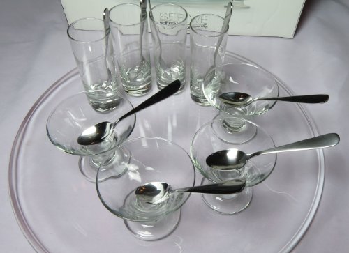 -. Feature : Glass Martini Glasses & Mini Shot Glasses; Stainless Steel Spoons / Set Includes: Four 2.75-oz. Martini Glasses, Four 2.5-oz. Mini Shot Glasses, Eight Spoons, One 12.9" platter, One Recipe Card / Dishwasher Safe