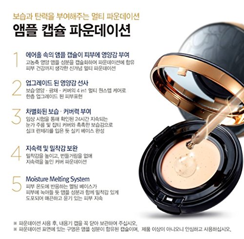-. Feature : Ampoule Capsules in the Air Holes Explodes on the Skin and Gently Absorbed to Create Healthy and Lively Skin / Moisturizing / Nutrition / Brilliance / Cover of the 4 in 1 multi one step care for upgraded skin. / Completes silky base like a silk lingerie with blemish and wrinkle cover and moisturizing effect for whole day. / Multi-base reacting in skin temperature increases skin fitting and removes grease to keep your skin smooth and shiny for a long time. : SPF50+ PA+++ / Major Ingredients : Acai palm oil, collagen, hyaluronic acid, vitamin C derivative, 7, blended ingredient (Patent No. 10-0910747)