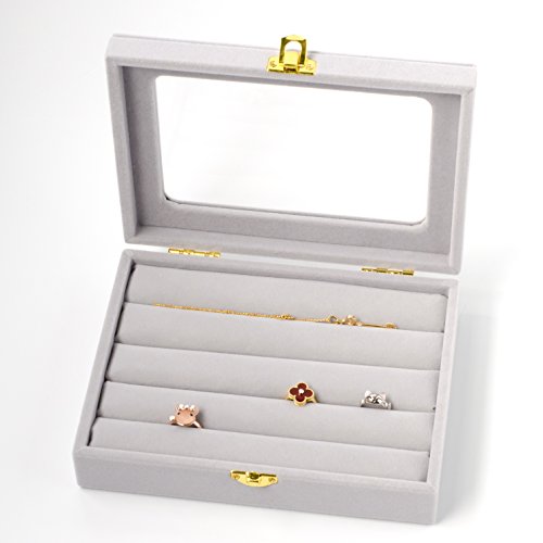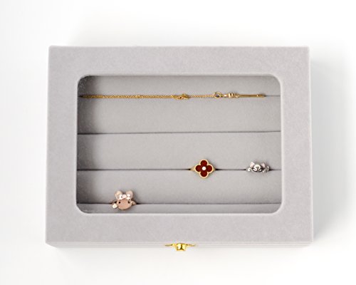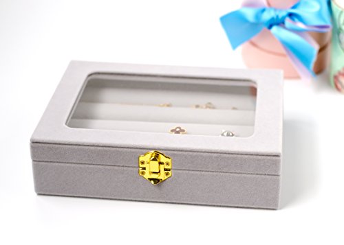 Buir Finer Things Velvet Jewelry Box, Clear Glass Top for Jewelry Display and Metal Buckle Closure – 3 Color Options (Dove Grey)