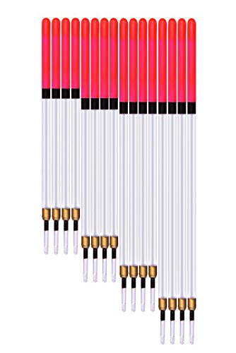 -. Feature : 5 Sizes: 11 cm, 13 cm, 15 cm, 17 cm and 19 cm in lengths, each measures 6 mm in width, can meet your different fishing needs / Colors: the body part of the float is clear, and the float tail is red, which is obvious and eye-catching, you can see the float clearly from far places / Features: made of plastic with uniform texture and good buoyancy, lightweight and sensitive, could get into water fast with small resistance, fast turning over with already drilled hole for fishing thread / Non weighted floats: as you see in the picture, the golden parts are painted, but they are part loaded with plastic block, you can still use these floats directly / Note: when in summer, do not store them in hot places; After use, wipe clean with soft paper or clothes; Store them in boxes for floats