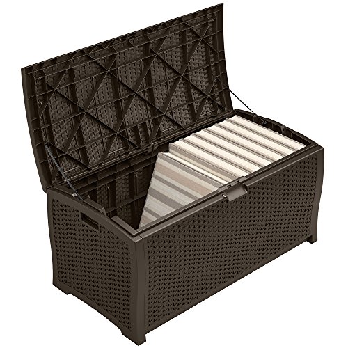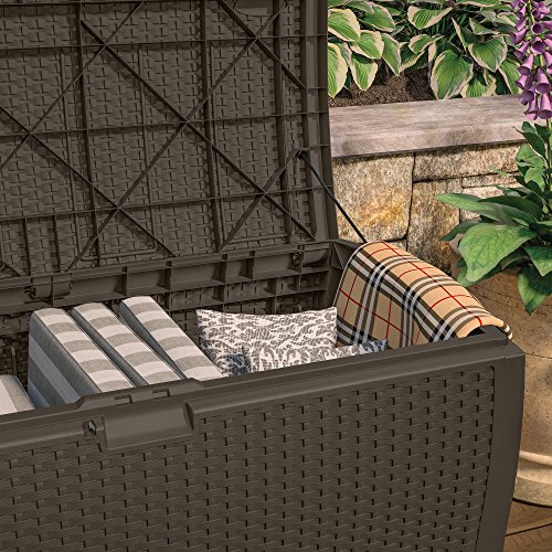 -. Brand : Suncast -. Feature : Deck box features a 99-gallon capacity; Assembled dimensions :50 w X 25.5d X 25.5 h in Inches / Ideal for storing cushions and other patio accessories; Long-lasting resin construction / Easy 5-minute, tool-free assembly; Accepts padlock where applicable / Design includes handles on each end and a stay-dry design / Features a contemporary design; mocha brown exterior / Durable contemporary design brings style and harmony to any outdoor setting / Capacidad de 73-gallon / Ideal para almacenar patio accesorios / Fácil de montar, tools-free de 5 minutos / STAY Dry - Diseño -. ProductGroup : Lawn & Patio -. ProductTypeName : OUTDOOR_LIVING -. Title : Suncast DBW9200 Resin Wicker Deck Box, 99-Gallon