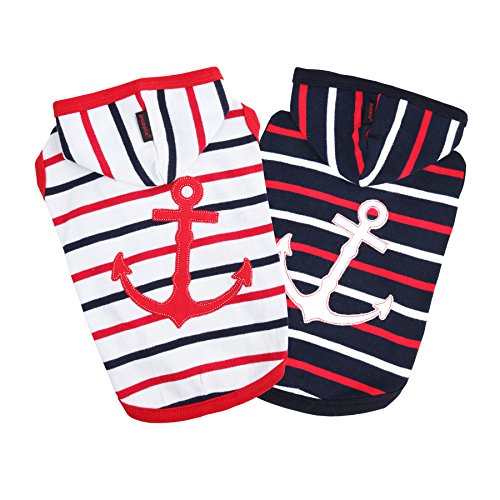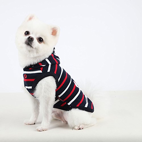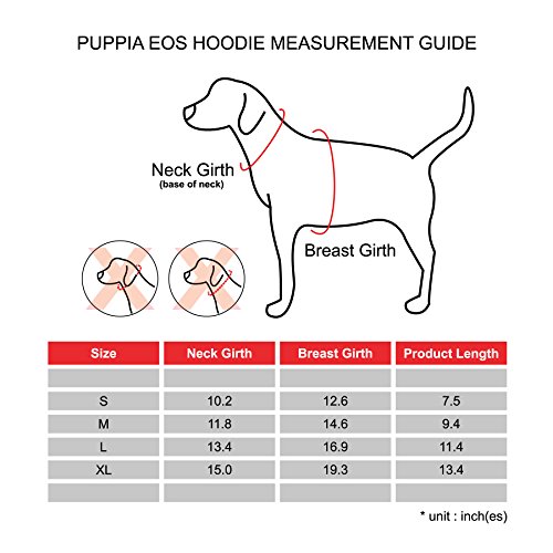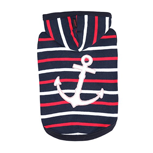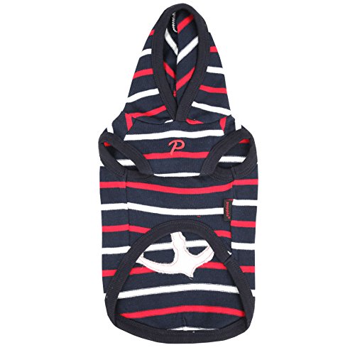 Studio : Puppia Int'l Inc. Publisher : Puppia Int'l Inc. Binding : Misc. Product Description The Eos hoodie is part of the newest Puppia spring/summer collection. Featuring an anchor applique on the back with hood, this shirt has a stripe pattern and solid scheme. Made out of 100% cotton, it is available in red and navy in sizes ranging from small to extra-large. Please note that because these products were created with small/medium dog breeds in mind, larger sizes (i.e. Large, extra-large, etc.) Do not necessarily mean larger breeds. Please refer to image of the size chart. It is very important to measure your dog with a tape measure according to the size chart. As a general rule of thumb, if your dog falls in between sizes, it is usually better to go up a size. Weight figures are for estimates only. Always use actual measurements. Please note that when measuring your dog for clothing, it's very important to have an accurate measurement of your dog's neck and chest girth. Important: please note that when measuring your dog, the measurement for the neck must be taken at the base of the neck and chest girth must be taken behind the front legs. Also it is important to take into account the size of the dog's head as well as neck girth and chest girth. Since some dogs have a much larger head than their neck, please be sure that the neck opening is large enough to slide over your dog's head. 0