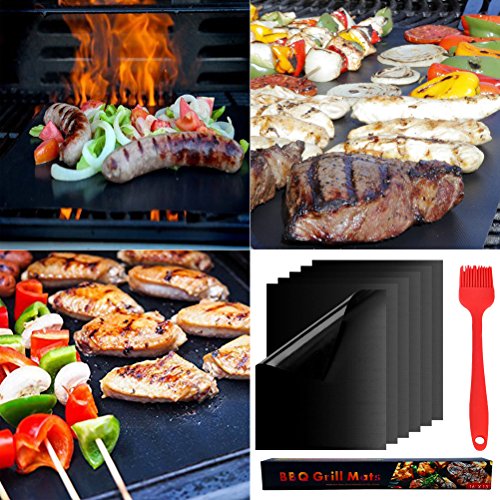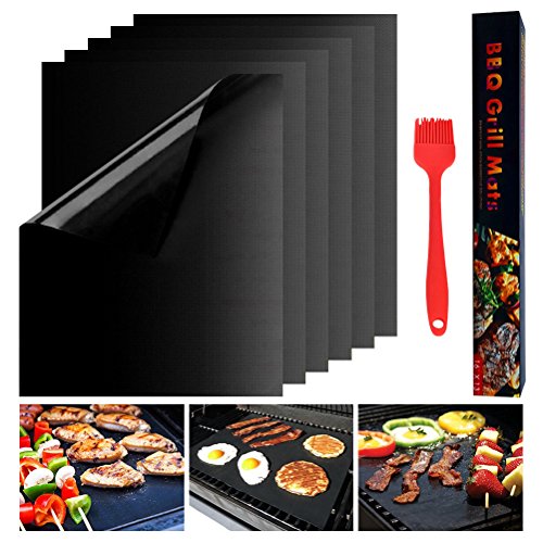 6pcs BBQ Grill Mats Odowalker Picnic Black Barbecue Grill Mat set of 6 Non-stick Reusable Heat-resistant Easy to Clean with a Seasoning Silicone Brush for Gas, Charcoal & Electric Grills 15.75"×13"