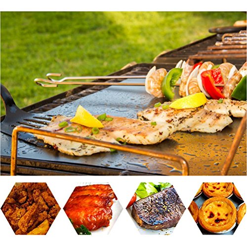 - NON-STICK:You can grill food without grease,seasoner or food stick on the grill mats.Very easy to clean and dishwasher safe.Moreover,it will keep your grates grill clean and neat,no more annoying cleaning work about the mussy grill after the bbq party.