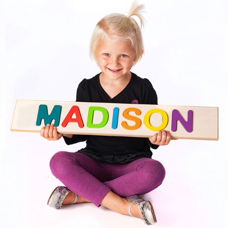 -. Feature : A custom name puzzle designed just for your child! / Unusual names & spellings delivered no problem, however only capital letters and spaces can be used. / Up to 9 characters (including spaces) available per puzzle. / Encourages logic, fine motor skills, letter recognition, name spelling, self esteem. / The length of the backboard depends on the length of the letters in the name, not all puzzles are equal in length.