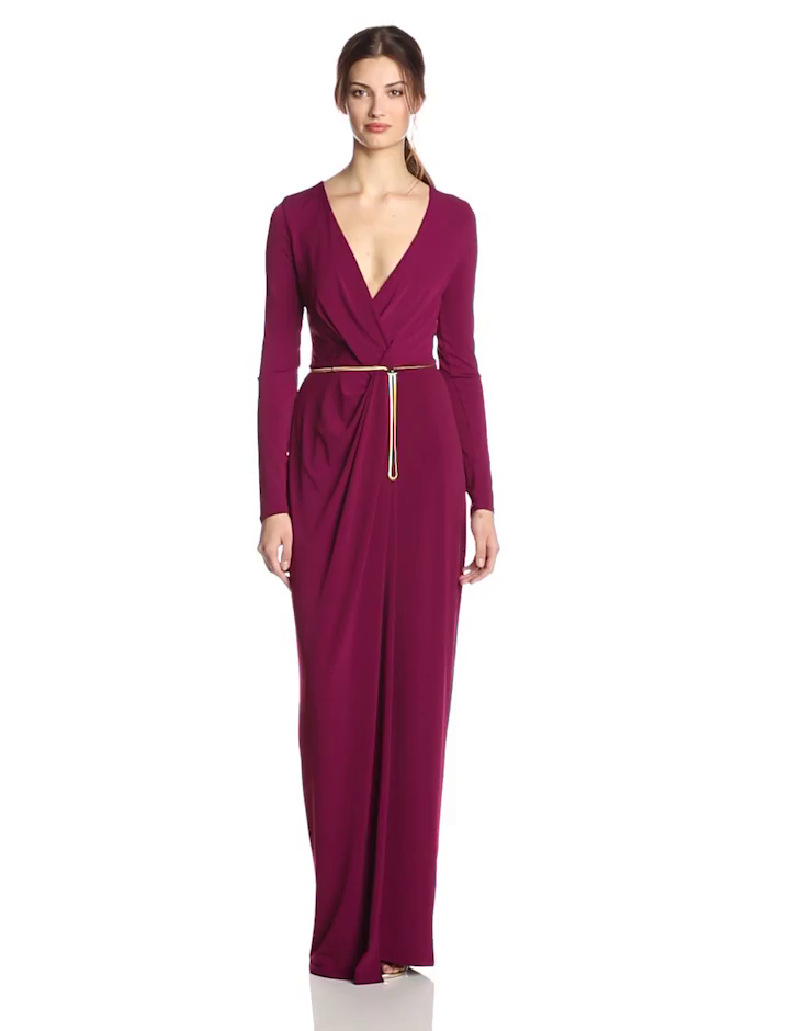 Jersey evening gown featuring pleated surplice bodice and deep V-neckline Cutout back Includes gold-tone chain belt Brand : Halston Heritage Item model num : JO160403 EAN : 0846153578078 Product Dimensions(LxWxH) :