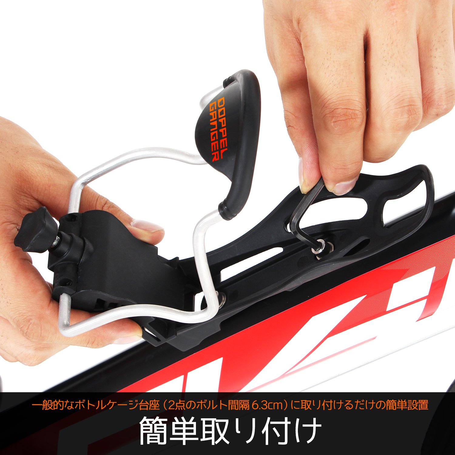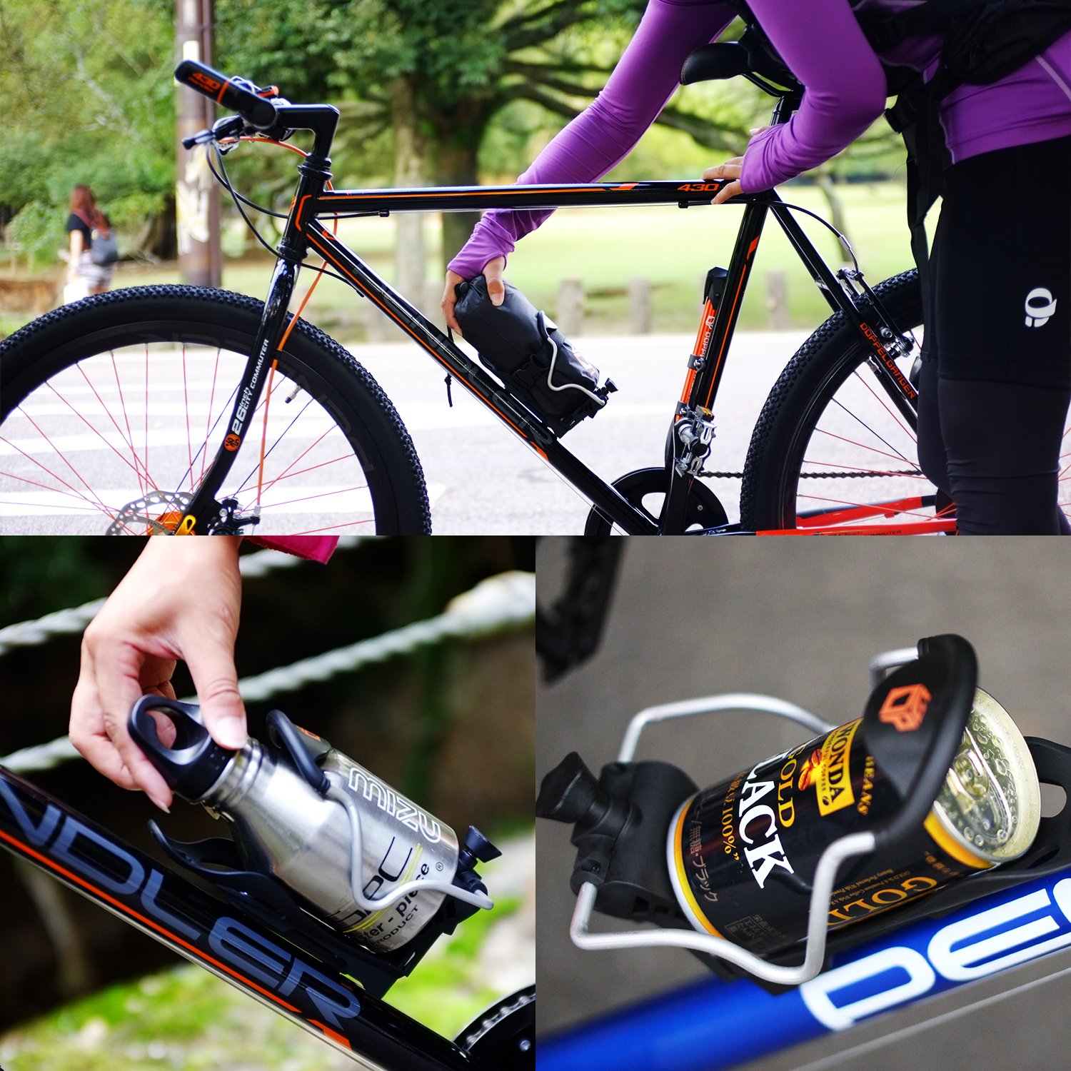 Frame part It is a bottle cage that takes into consideration the convenience with the lightness of aluminum material and the cushioning property of rubber material which does not hurt the object to be attached.