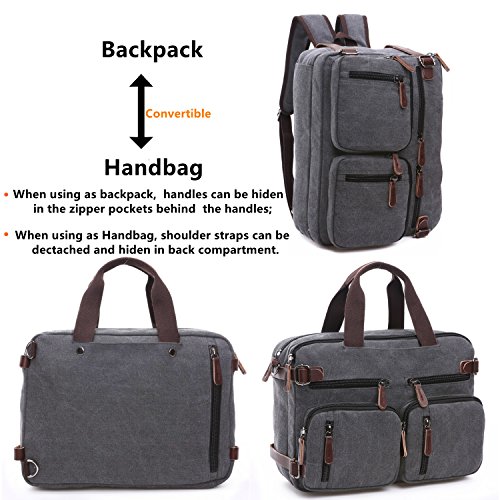 -. Feature : Top-quality, dense, durable canvas with a bit of PU leather straps which furthers the overall vintage-rustic look of this new backpack messenger bag / Size: 38.5 x 28.5 x 13 CM / 15.1 x 11.2 x 5.1inch , fits 14 Inch laptop easily / 3-in-1 Multi-Purpose: Briefcase Transforms ,Sleek and versatile design, the bag is convertible for use as briefcase, messenger bag, or backpack depending on need and carrying preference. / Extra Protection: Padded laptop compartment and interior to provide extra cushion for electronic accessories. Travel safe lockable zipper for protection against laptop theft. / Ergonomic Straps: Padded messenger and backpack straps for reduced body stress and comfort wear. Soft vegan leather padded handle grips and zipper pulls.