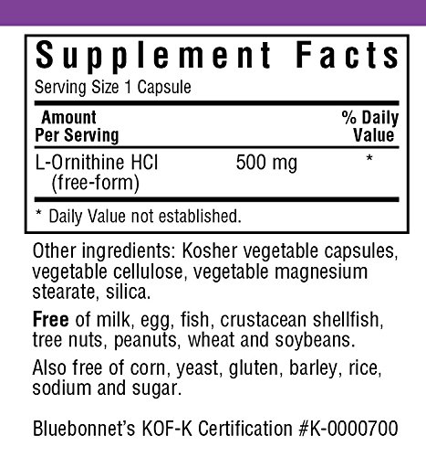 Bluebonnet's L-Ornithine 500 mg capsules provide pharmaceutical grade free-form amino acid L-ornithine HCl in its purest crystalline form. Available in easy-to-swallow vegetable capsules for maximum assimilation and absorption.Feature