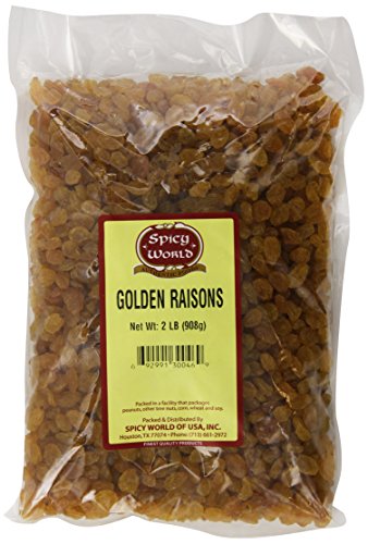 -. Binding : Grocery -. Brand : Spicy World -. EAN : 0692991300469 -. Feature : 2 pound of delicious California Golden Raisins - an incredible value / Hand picked from the finest farms in the USA / Makes for a great snack or use in bakery items / Quality ingredients, spices, and nuts since 1988 -. Label : Spicy World -. Manufacturer : Spicy World -. NumberOfItems : 1 -. PackageQuantity : 1 -. ProductGroup : Grocery -. ProductTypeName : GROCERY -. PublicationDate : 2014-05-14 -. Publisher : Spicy World -. ReleaseDate : 2014-05-14 -. Size : 2 Pound -. Studio : Spicy World -. Title : Spicy World Golden Raisins, Premium, 2 Pound -. UPC : 692991300469