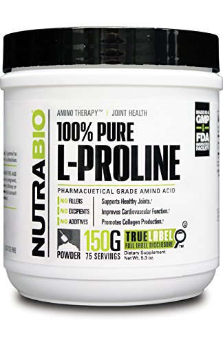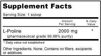 L-Proline is an amino acid involved in the production of collagen and cartilage and may help support healthy joints and a healthy musculoskeletal system. Proline is the only precursor to hydroxyproline, an essential component in the production of collagen, the 'cement' which holds together the skin, cartilage, ligaments, tendons and arteries. Proline supplementation is essential for restoring normal collagen production. Proline, along with the amino acid lysine and Vitamin C, is essential for the formation of healthy collagen and cartilage. It maintains the flexibility of both muscles and joints, and helps reduce sagging and wrinkling that accompany UV exposure and normal aging of the skin. Proline is also beneficial in the formation of bone, skin and cartilage and it is of paramount importance for the proper functioning of joints and tendons.Feature