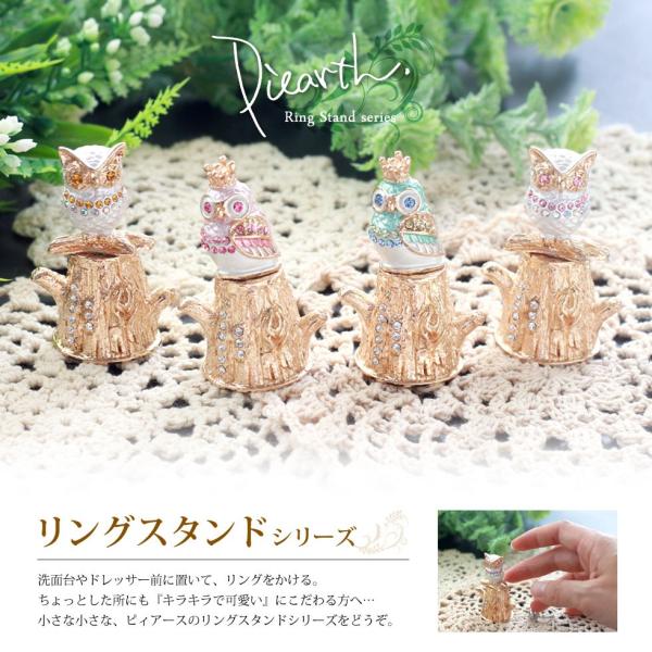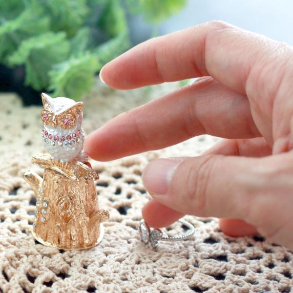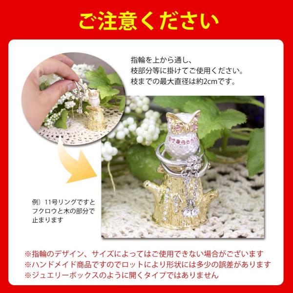 | 使用方法 | 指輪を上から通し、枝部分等に掛けてご使用ください。 枝までの最大直径は約2cmです。 指輪のデザイン、サイズによってはご使用できない場合がございます。 例)11号リングですと、フクロウと木の部分で止まります ※ハンドメイド商品ですのでロットにより形状には多少の誤差があります ※ジュエリーボックスのように開くタイプではありませんのでご注意ください |
