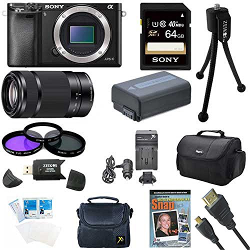 Sony Alpha a6000 Sony a6000 ILCE6000/B ILCE6000 24.3 Interchangeable Lens Camera - Body only with Sony E 55-210mm Lens BUNDLE with 64GB Class 10 Card, Spare Battery, Deluxe Padded Case, Micro HDMI Cable, DVD SLR Guide, SD Card Reader, and MORE