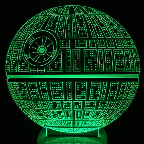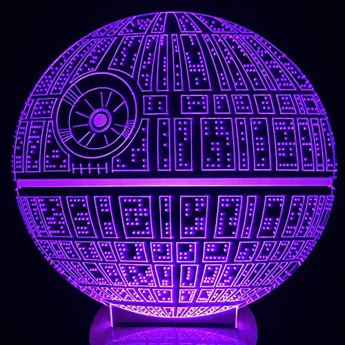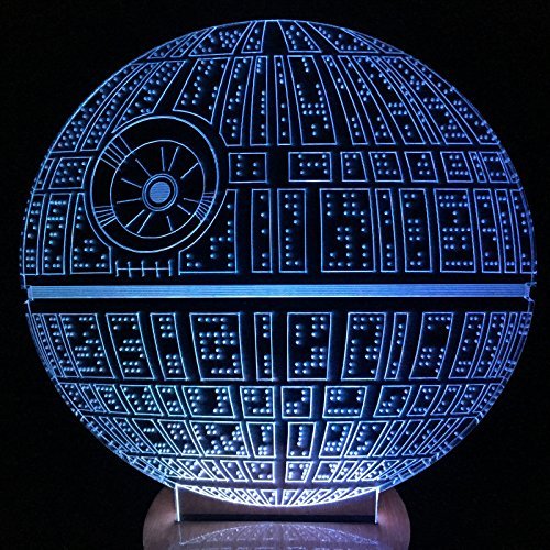 Death star lights. A glowing edge lit acrylic death star lights, inspired by star wars. Acrylic approx. size 14.5cmx18.2cm. You will be given a 24 key LED remote controller (see below) to customize the colors of the LED desk light. With the remote controller, you will have a variety of light setting which include to power on or off lights, pause or play, dim or change speed of lights and also to create rainbow of colors. It features innovative design of death star with 100% engraving that carved on its acrylic glass (Perspex) to allow light flow. This also means that it does not contain stickers or paints of any kind. It is also cool, quiet and energy efficient at the same time. How does it work? It is made of acrylic glass. Acrylic glass or Perspex have similar light transmitting properties like the fiber optics. Light introduced at one end will flow through the acrylic glass and later come out at other ends. This product includes a death star LED desk light, a 24 key LED remote controller. The 24 key LED remote controller require a cr2025 battery (included) to function. Also, its energy efficient LED lights has a long lasting lifetime of more than 50,000 hours. It is perfect for a desk decoration and also great as gift.Feature