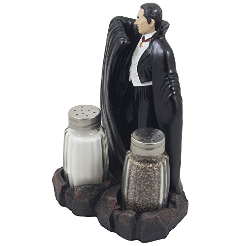 Spooky Count Dracula Vampire Salt and Pepper Shaker Set with Decorative Display Stand Holder Figurine for Horror Movie Theater Decor or Scary Halloween Decorations As Creepy Gothic Gifts