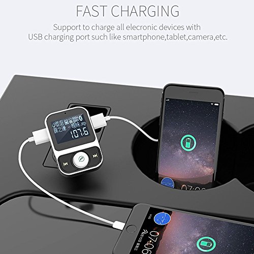 [ DUAL USB QUICKLY CHARGER ] FM transmitter has two USB ports, With an universal 5V-2.1A USB port designed for charging, and other one 1A port for reading USB files and charging;