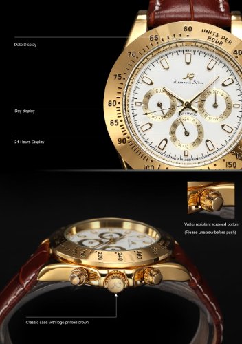 -. Binding : Watch -. Brand : KS -. Department : Mens -. EAN : 0700900780117 -. Feature : Original KS watch. Genuine Kronen & Söhne Watch / Present by Kronen&Söhne group, Imperial series / Precision Movement with the latest breakthrough Kronen&Söhne Patented Mechanical Technology / ATTENTION!!! Automatic movements mark the passage of time by a series of gear mechanisms, and are worked by the movement of your wrist as you wear it. It will stop if the watch stop moving for a long time, please turn the crown of watches by hand / Be Sent in a solid box with a warranty card. 12 months International Guarantee -. Label : KS -. Manufacturer : KS -. MPN : KS162 -. PackageQuantity : 1 -. PartNumber : KS162 -. ProductGroup : Watch -. ProductTypeName : WATCH -. Publisher : KS -. Studio : KS -. Title : KS Imperial Day Date Gold Case Brown Leather Men Automatic Mechanical Wrist Watch KS162 -. UPC : 700900780117