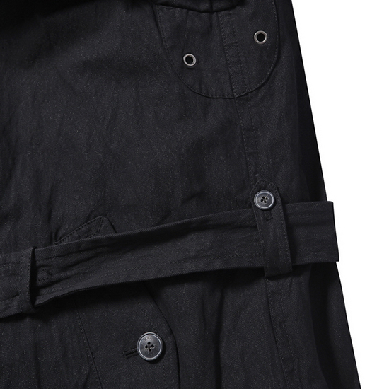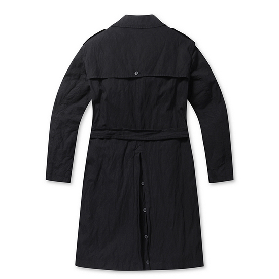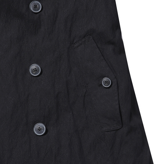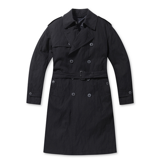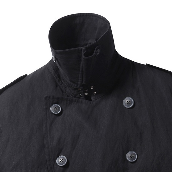 - 더블 버튼 디자인의 모던한 남성 트렌치 코트.