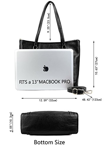 -. Feature : Cow leather with light gold color hardware, sturdy double stitching and reinforced handle for durability. / Zipper top closure. This bag can hold 13" thin laptop whose size under 12.99"(length) x 9.1"(width), wallets, books and lots of things. / One Front Pocket and one back zipper pocket for quick access. The inside has 2 main compartments with a center zippered piece, 2 open pockets and a zipped pocket. / Handle drop is 9.25", comfortable to wear on your shoulder. Durable and roomy for everyday use. Also come with a long shoulder strap(48.42" in length) for more carrying options: Handheld/ Single Shoulder/ Crossbody. / Dimensions: 12.59" x 4.05" x 10.63". The Weight is 1.85 pounds.
