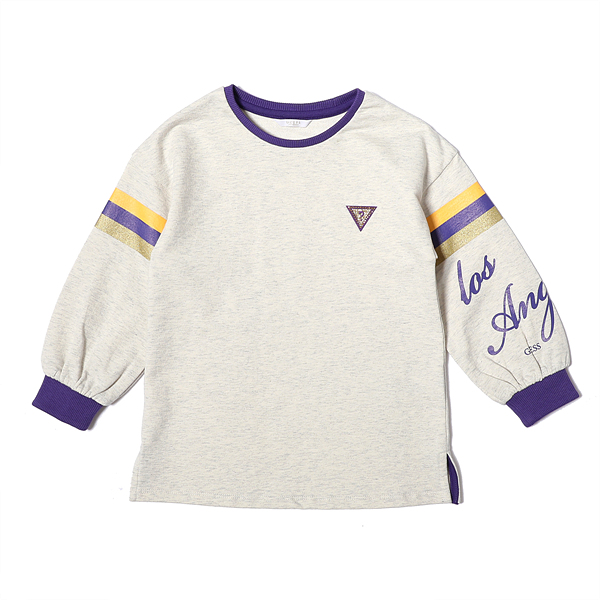 베이직한 디자인의 롱티에 소매에 스트라이프 컬러 나염이 있는 스포티하면서도 유니크한 여아 롱티입니다.
