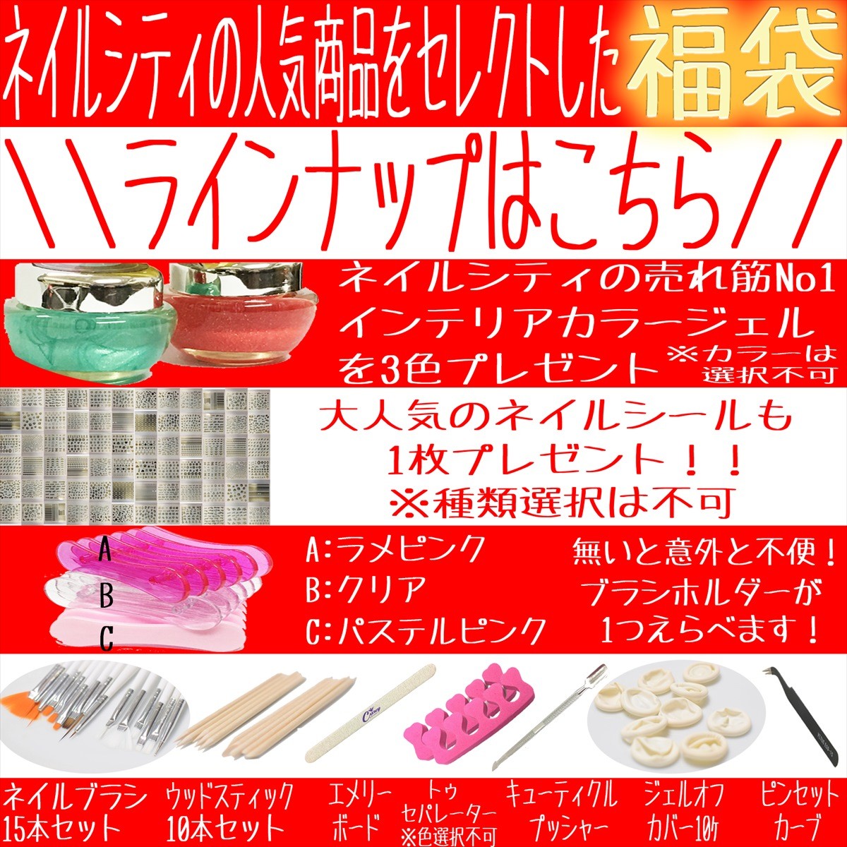 \\ネイルシティもやります//◎人気アイテムを厳選した新春福袋◎★価格によってバリエーションが異なる3種類をご用意しました★★商品によってカラー選択が可能なのも嬉しいですよね★インテリアカラージェル欠品中カラー1636欠品中のカラーを選択、選択商品が空欄の場合は当店にてオススメのカラーをお選びします。O訳あり理由Oコスト削減の為発送梱包が簡易となります。内容量が若干少ない場合がございますが、極端に少ないものは無いのでご安心ください。ラベル・カラーネーム変更の為品番によりラベルが異なります。画像を見る環境によって色合いが異なる事がございます。商品によっては成分やホログラムが沈殿している場合がございますが、よくかき混ぜてから使用して頂ければ問題はありません。