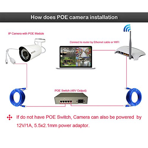 -. Feature : Stunning HD 1080P (1920TVL) Video at 25fps. Record and Playback via CMS on Computer, or ONVIF NVR (Hikvision, Dahua, Amcrest...) and Software(Blue Iris, iSpy, Synology... ) / Connect camera to a 48V POE switch, it can tranfer power+data via a single Ethernet cable up to 100m, or justc connect camera to power adaptor and router if you do not have POE switch, install CMS on PC, then it will detect all cameras in LAN; With our free App "NVSIP", get Seamlessly Stream Video Locally and Remotely on Your Smartphone, Tablet, or Windows PC / Remarkable Field of View with Super Wide 80 degree Viewing Angle, Remote Access, Intelligent Digital Zoom on PC and phone APP, and IR LED Night Vision Up to 32 feet / Intelligent Motion Detect and Email Alert, Send email with snapshot / Full 1-Year US Warranty and Lifetime Support Provided Directly from HOSAFE. Our support team is available at support@hosafe.com, reply in 24 hours, Please Note : This is a 2.4ghz supported camera and it does not support 5ghz networks.