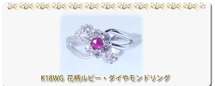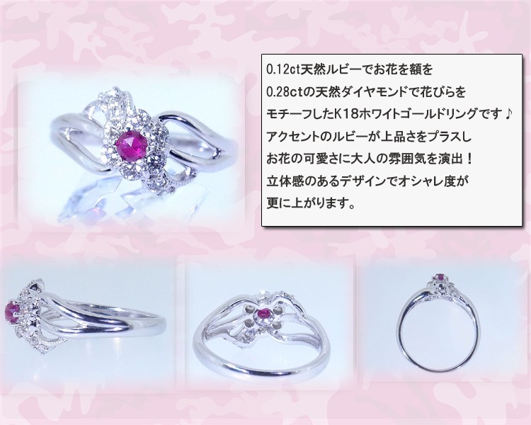 商品説明 0.12ctルビーでお花の額を0.28ct天然石ダイヤモンドで花びらと葉っぱをモチーフしたK18ホワイトゴールドの大人のかわいいリングです。