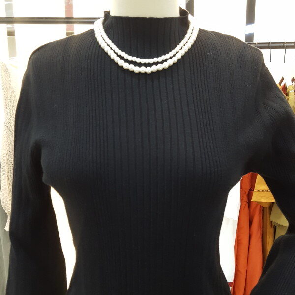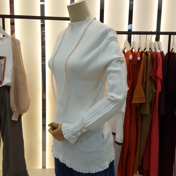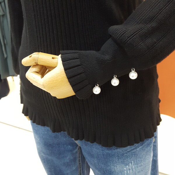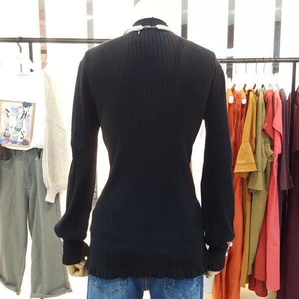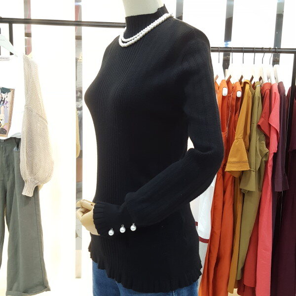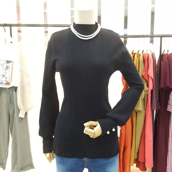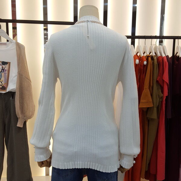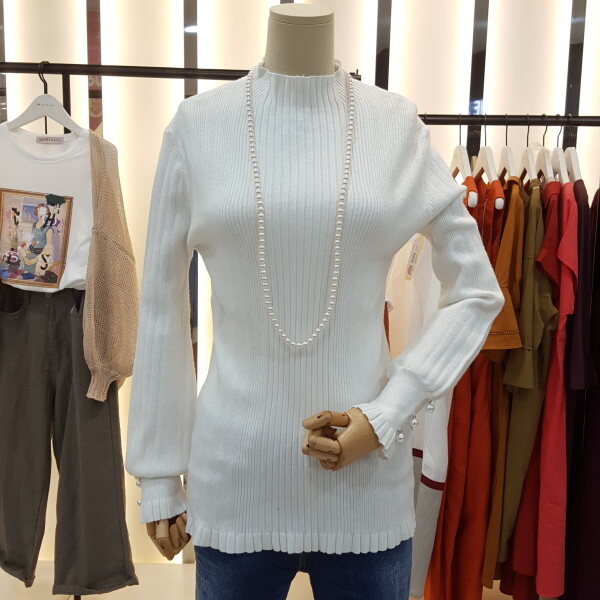 소매 진주버튼 장식이 우아하게 느께지는 니트입니다.곡선의 벌룬 실루엣이 감각적이며 고급스러운 터치감으로 바디라인에 피팅되어 슬림한 핏의 제품입니다.
